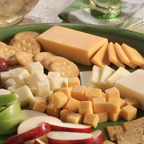 Assortment of sliced cheeses, fresh breads, pastries and jam.